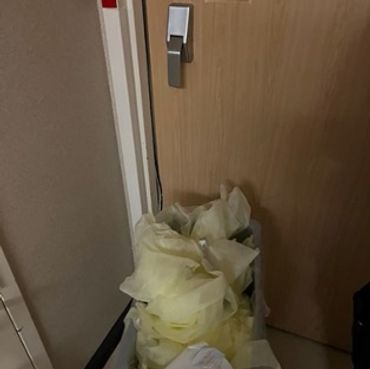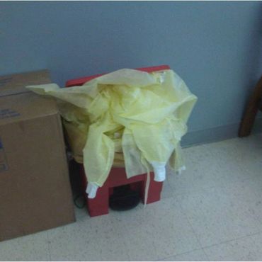 In a study examining doffing of 48 health care personnel (HCP) across eight units, deviation in the process of doffing were numerous. The variation and or errors occurred with rolling up the disposable isolation gowns with bare hands, not rolling up the gown with removal resulting in overflowing trash receptacles and gowns on the floor. These factors contribute to the lack of cleanliness of the room as perceived by patients and families.
